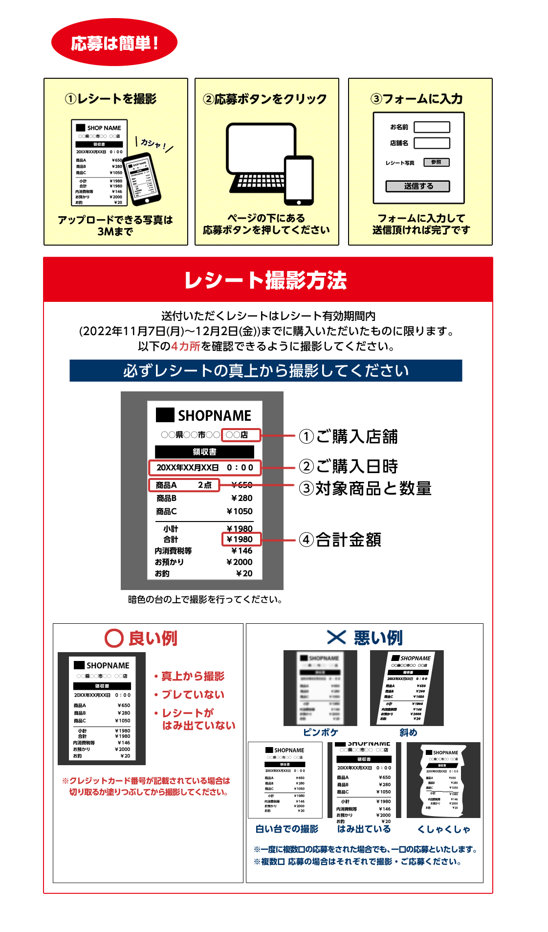 ●同一のレシートで本キャンペーンに重複して応募があった場合は、いずれか一つのご応募のみ有効とさせていただきます。
